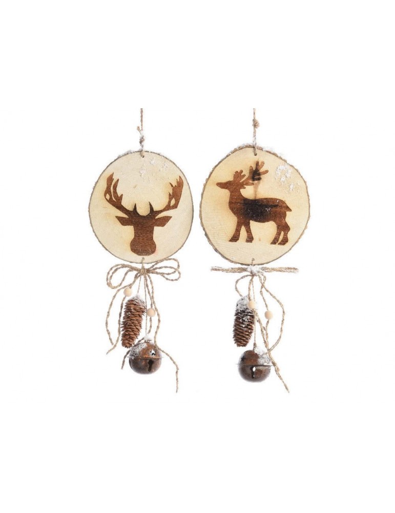 Caractéristiques techniques : Matière : bois Forme : ronde Motif : assortis (élan et renne) Finition : Cordon naturel Cloche en fer Pin Dimensions : Hauteur : 44 cm Largeur : 20 cm Profondeur : 6 cm