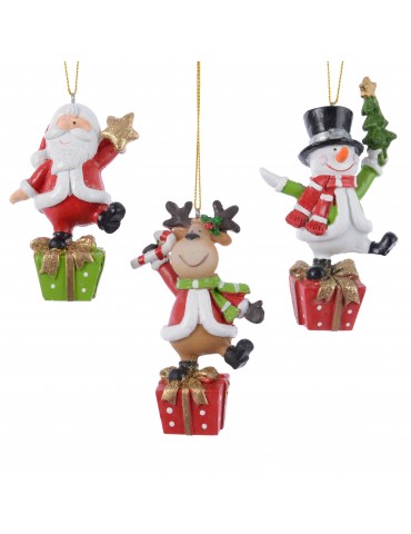 Caractéristiques techniques : Matière : polyrésine 3 figurines assorties : Père Noël, renne et bonhomme de neige Dimensions : Longueur : 3.5 cm Largeur : 6.6 cm Hauteur : 11 cm
