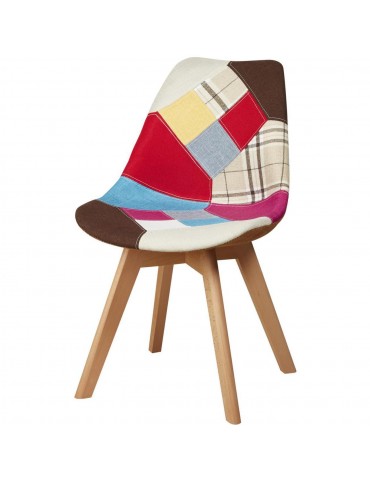 Lot de 4 chaises tendance façon patchwork aux inspirations scandinaves alliant un mélange frais et harmonieux de couleurs et des pieds en bois naturel.