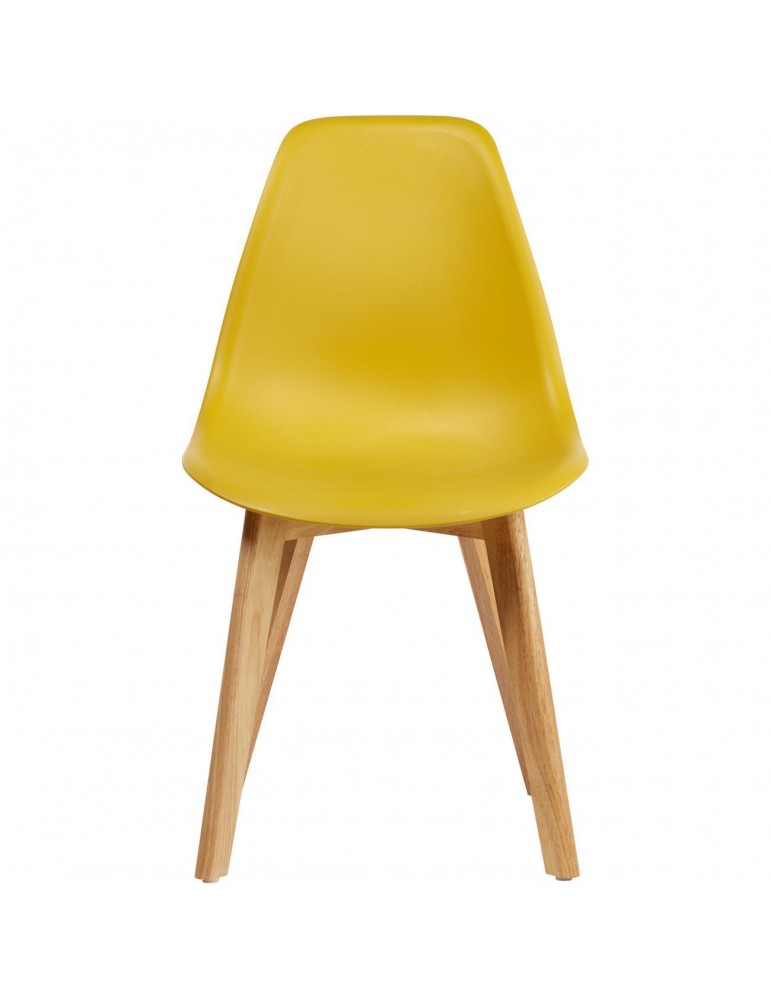 Lot de 4 chaises tendances et actuel en coque jaune aux lignes scandinaves et pieds en bois naturels.