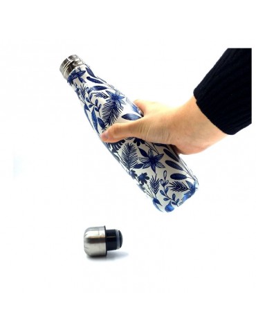 Très jolie bouteille isotherme 500ml blanche avec motifs à fleurs dessinés en traits fins bleus foncés à emporter partout avec vous. Le bouchon est en couleur argent et orné d'un joint silicone étanche.