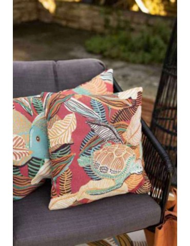 Tortues de mer et poissons exotiques se pavanent tranquillement sur ce coussin au motif aquatique, tissé en jacquard 100 % polypropylène. Conçu spécialement pour résister aux conditions extérieures, il est équipé d'une fermeture zip étanche qui protège l'intérieur du coussin contre l'humidité. Son design inspiré de l'eau et de ses mouvements fluides crée une atmosphère sereine, que ce soit sur votre terrasse, balcon ou jardin. Le petit plus : il est différent au verso pour varier les styles. Pratique, durable et facile à entretenir, ce coussin est le choix parfait pour ajouter du confort et du style à vos moments en plein air.