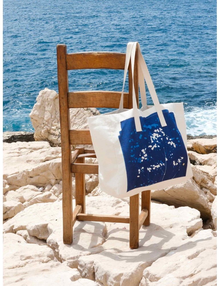 Emportez une oeuvre d'art avec vous grâce à notre sac cabas en coton biologique, issu de la collection en édition limitée ""La Cerise sur le Gâteau X Invincible Été"". Les motifs bleus inspirés du cyanotype et imprimés numériquement ajoutent une dimension esthétique à ce sac pratique. Sa toile solide et son grand format le rendent idéal pour diverses utilisations, du marché au bureau. Fabriqué au Portugal, il incarne une démarche écoresponsable sans compromettre le style.