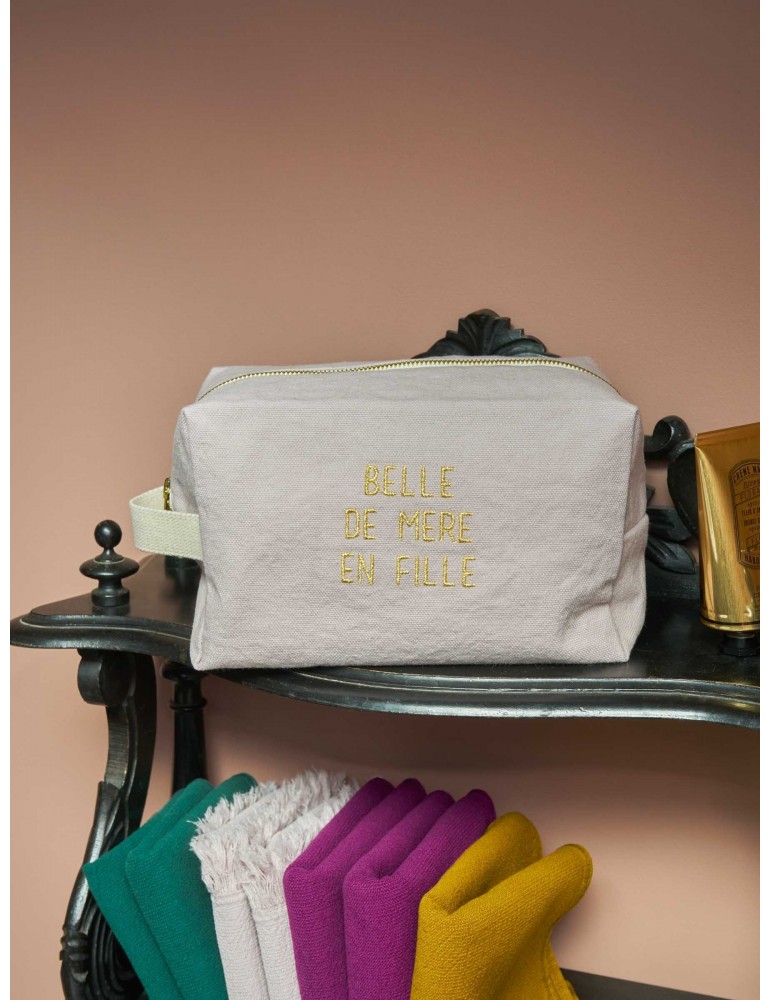 Offrez un cadeau symbolique et raffiné avec cette grande trousse cube en coton biologique, brodée de l'inscription dorée ""belle de mère en fille"". Sa conception soignée et son message tendre en font l'accessoire idéal pour témoigner d'un lien unique, tout en apportant une touche d'élégance à la routine quotidienne.