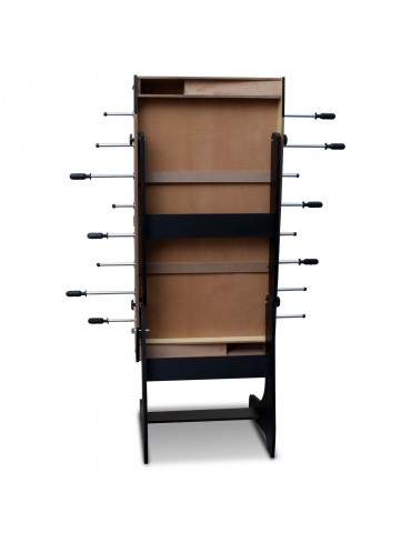Baby foot pliable en bois clair et pieds noirs. Ce baby foot sera facile a ranger le long d'un mur grâce à sa position verticale.